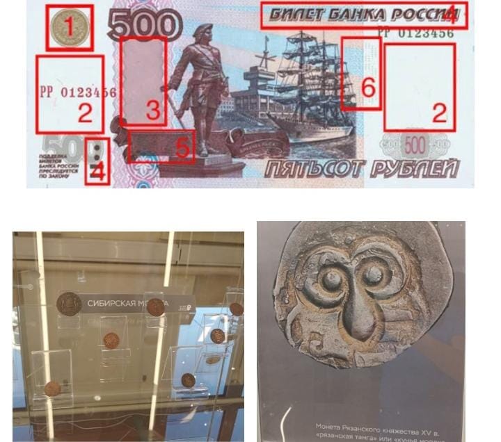Современные банкноты: Экскурсанты рассмотрели современные российские деньги и узнали, как их защищают от подделок, а главное самое научились определять подлинность купюр по семи признакам, о которых не каждый из нас догадывается: Некоторые отличительные знаки подлинности купюр номиналом 500 рублей: