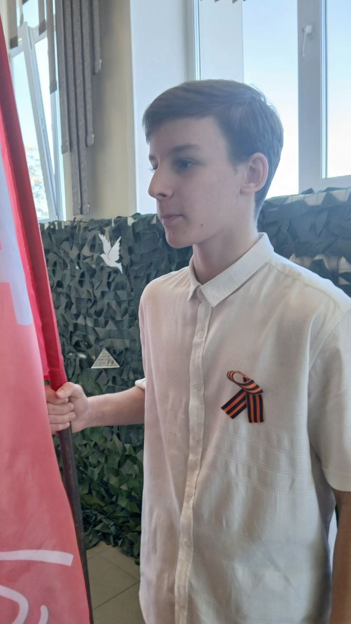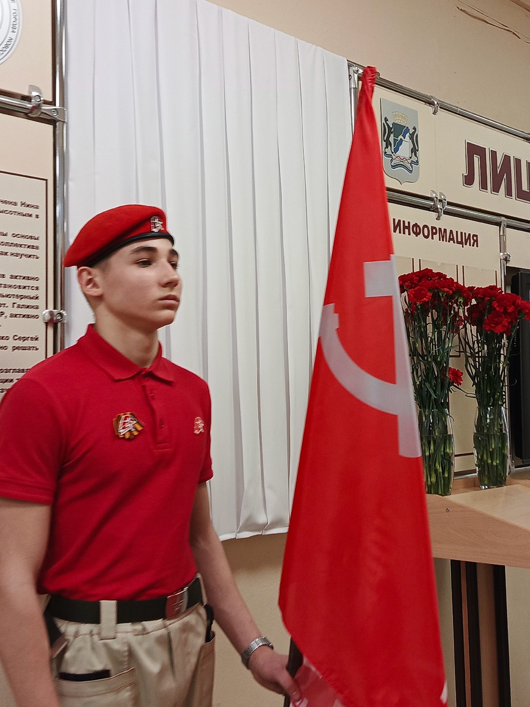 В лицей была представлена копия Знамени Победы. Как и положено, возле него был выставлен часовой. Смена часового проходила в соответствии с требованиями устава, и наши ученики с гордостью несли почётный караул.