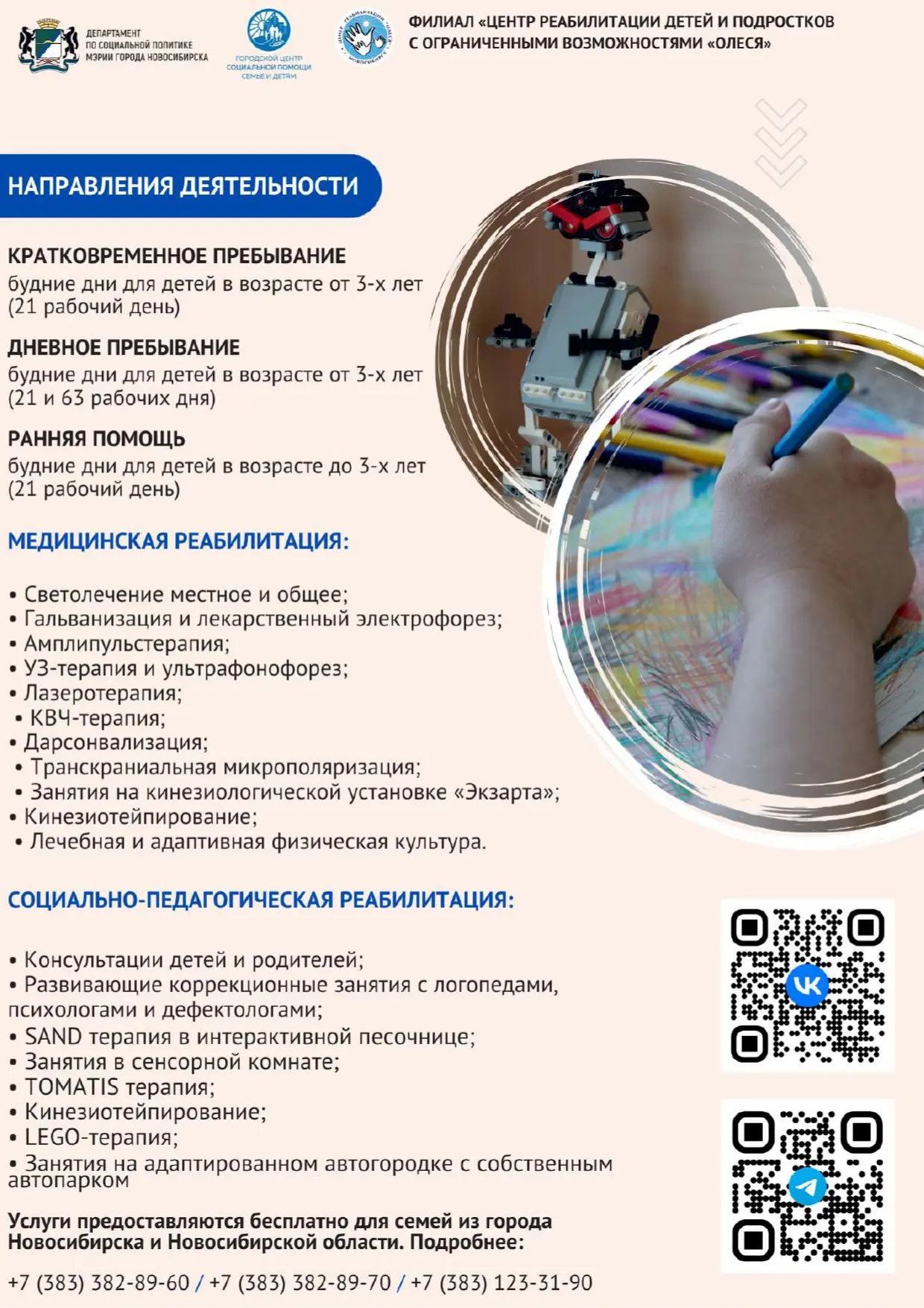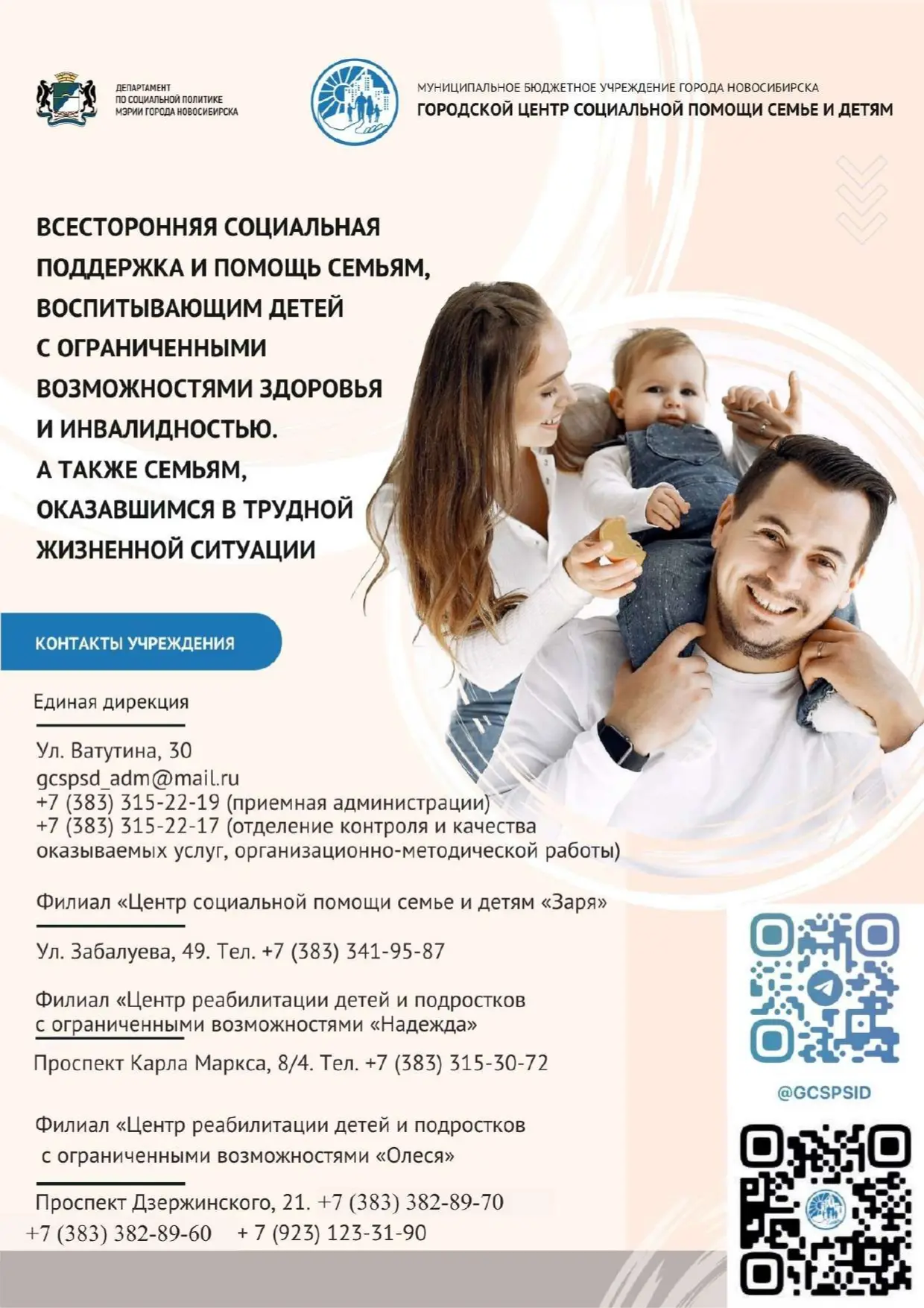 Муниципальным бюджетным учреждением города Новосибирска «Городской центр социальной помощи семье и детям» предоставляется уникальный комплексс реабилитационных услуг семьям, воспитывающим детей с ограниченными возможностями здоровья и инвалидностью в возрасте от рождения до 18 лет на безвозмездной основе на базе трех филиалов – «Центр социальной помощи семье и детям «Заря», «Центр реабилитации детей и подростков с ограниченными возможностями «Надежда» и «Центр реабилитации детей и подростков с ограниченными возможностями «Олеся».